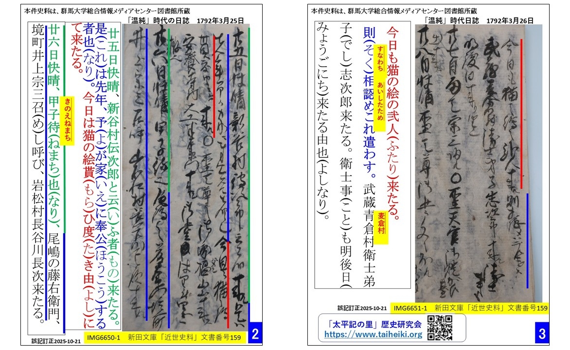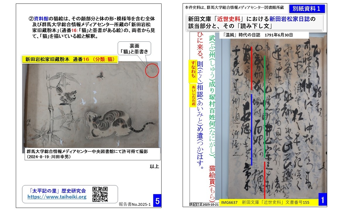 ・新田(岩松)家の歴代当主の中で最初に「猫絵」を描いたという「温純」について、新田(岩松)家の日誌、絵画等を調査した結果を報告書形式で提出しました(当研究会の自主研究)。*誤記の指摘あり、微修正済(該当文中、黄色枠内に訂正文字記載2025-10-21)