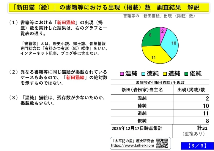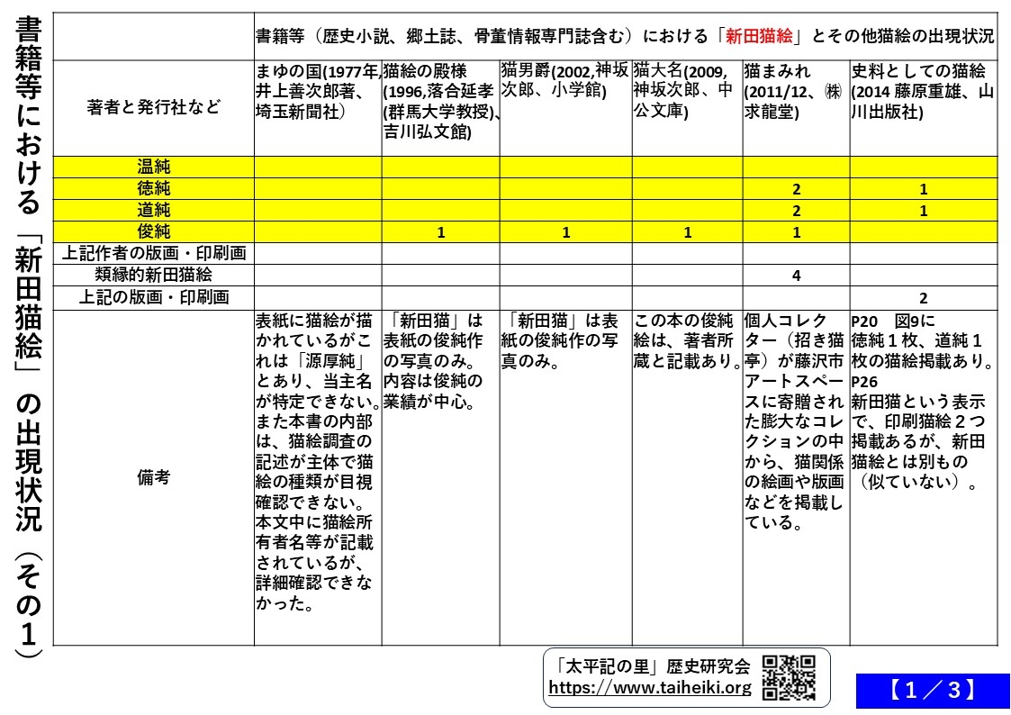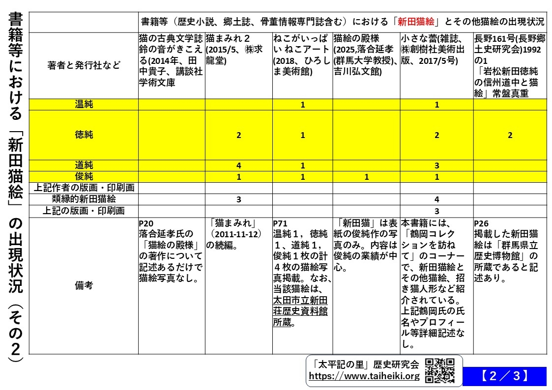 書籍等(歴史小説、郷土誌、骨董情報専門誌含む)11種類における「新田猫絵」の出現状況調査しました。下記の各画像をご覧下さい(画像タッチすると、パソコンでは、自動拡大表示)。2025-12-17 AM11:15公開